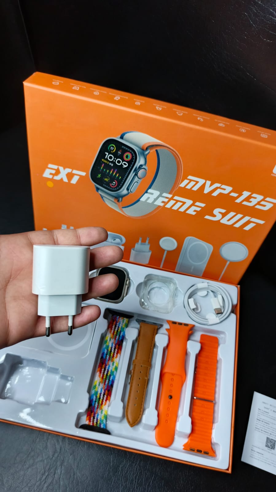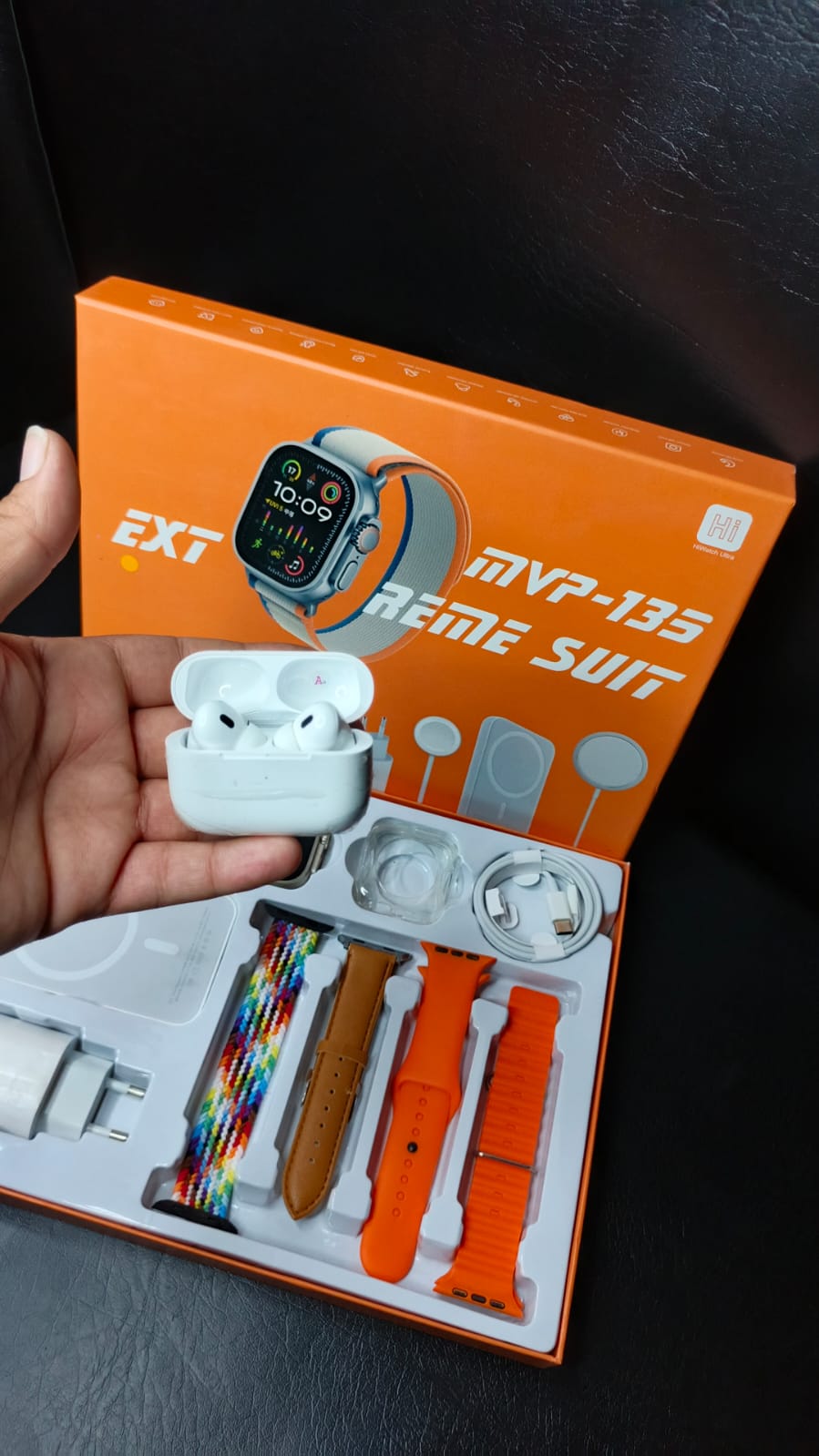 Designed for those who demand power, performance, and perfection in one box, this exclusive combo brings everything you need — a high-quality Smart Watch, multiple straps, Airbuds, wireless chargers, and more!